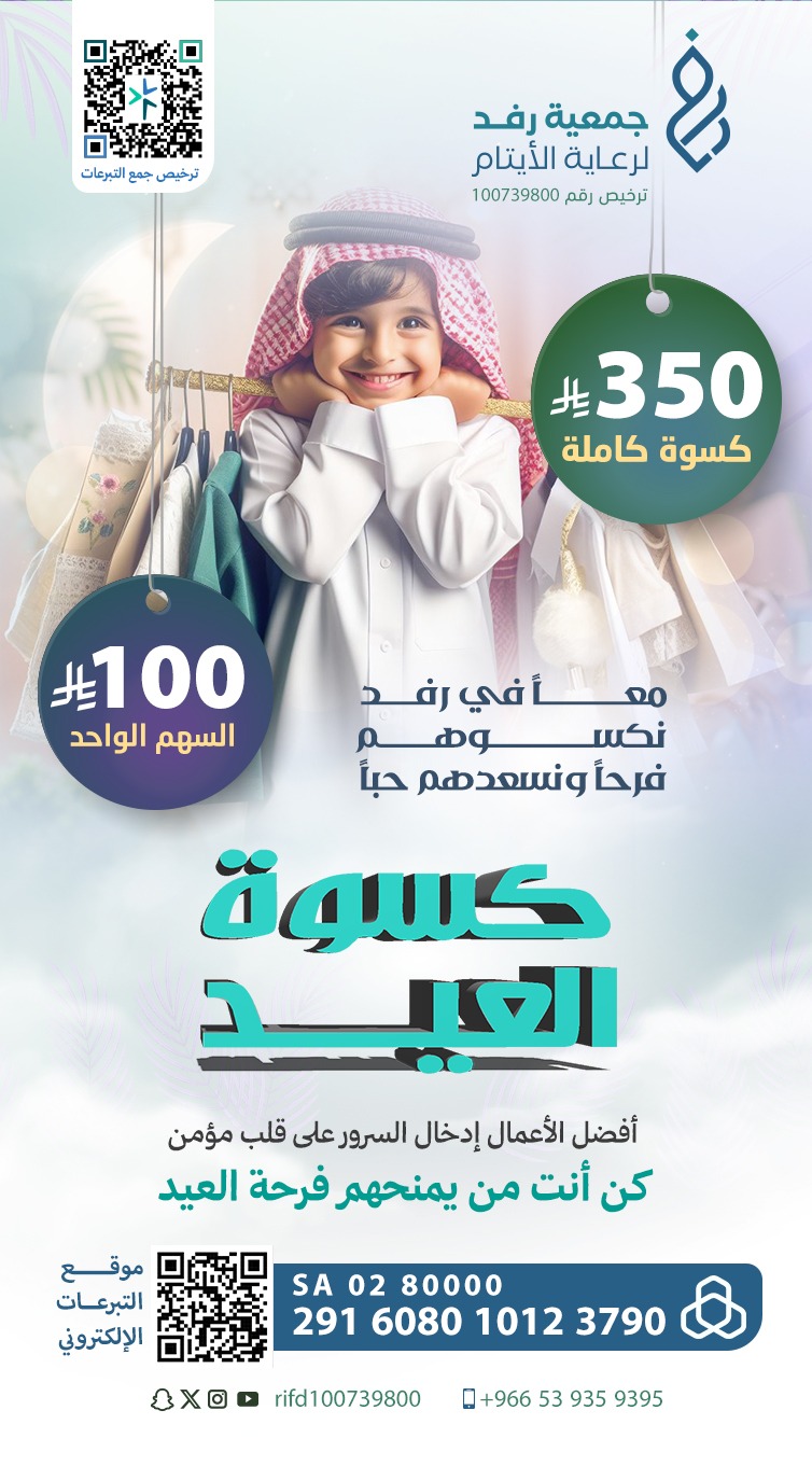 في جمعية رفد لرعاية الأيتام، نؤمن أن اليتيم لا يحتاج فقط إلى الرعاية، بل يحتاج إلى الشعور بأنه كغيره من الأطفال، لا ينقصه شيء ليواجه يومه بابتسامة وثقة. انطلق مشروع "كسوة يتيم" ليكون اليد الحانية التي تمسح على رأس اليتيم، وتسد ثغرات احتياجه الأساسي بكرامة وحب.